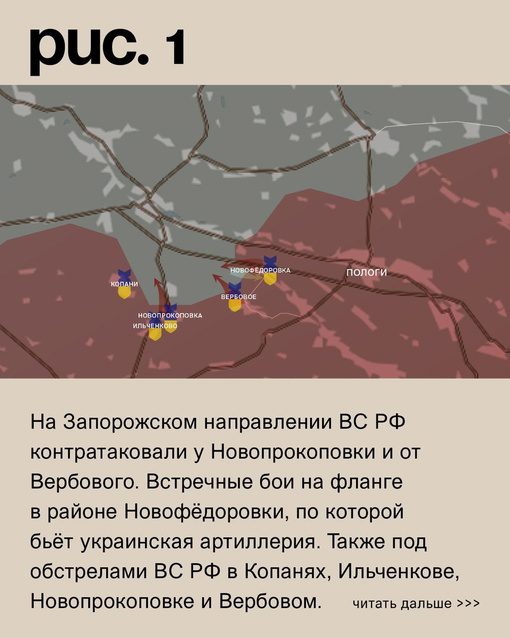 На Запорожском направлении, российские вооруженные силы совершили контратаку у Новопрокоповки и Вербового. Возникли стычки на фланге в районе Новофёдоровки, где украинская артиллерия производит обстрелы. ВС РФ также подверглись обстрелам в Копанях, Ильченкове, Новопрокоповке и Вербовом, а ВСУ подверглись ударам в населенных пунктах Орехов, Новоданиловка, Работино и Малая Токмачка.