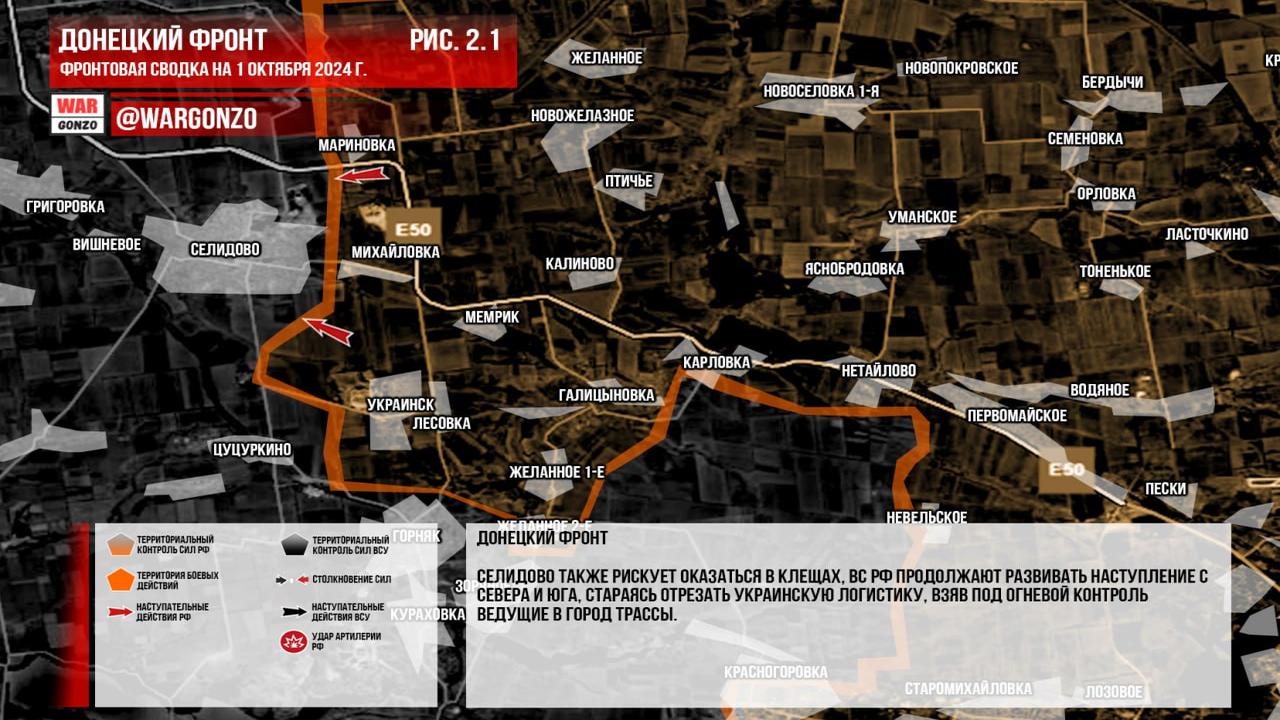 Ситуация на 01.10.2024 21:05. Канал Рыбарь сообщает: на Покровско-Кураховском направлении российские войска продолжают наступление, особенно в районе Селидово и Цукурино. Российская армия активно освобождает территории Донецкой Народной Республики на фронте протяженностью более 80 километров, фиксируя успехи как на северных флангах, так и юго-восточнее Курахово. Сообщается о вытеснении противника на правый берег реки Казенный Торец, а также о захвате двух крупных опорных пунктов в районе Гродовки. На рубеже Николаевка — Сухой Яр российские подразделения продвинулись и закрепились в лесополосе. Бои продолжаются на южной окраине Цукурино, а российские войска также проводят атаки на позиции украинских формирований. Далее, южнее, россияне выбили ВСУ с позиций между Острым и Максимильяновкой. Ситуация к западу от Невельского несколько прояснилась, и теперь имеется информация о продвижении российских войск в низине у Желанного Первого и Второго, хотя сохраняется вероятность присутствия ВСУ в этом районе.