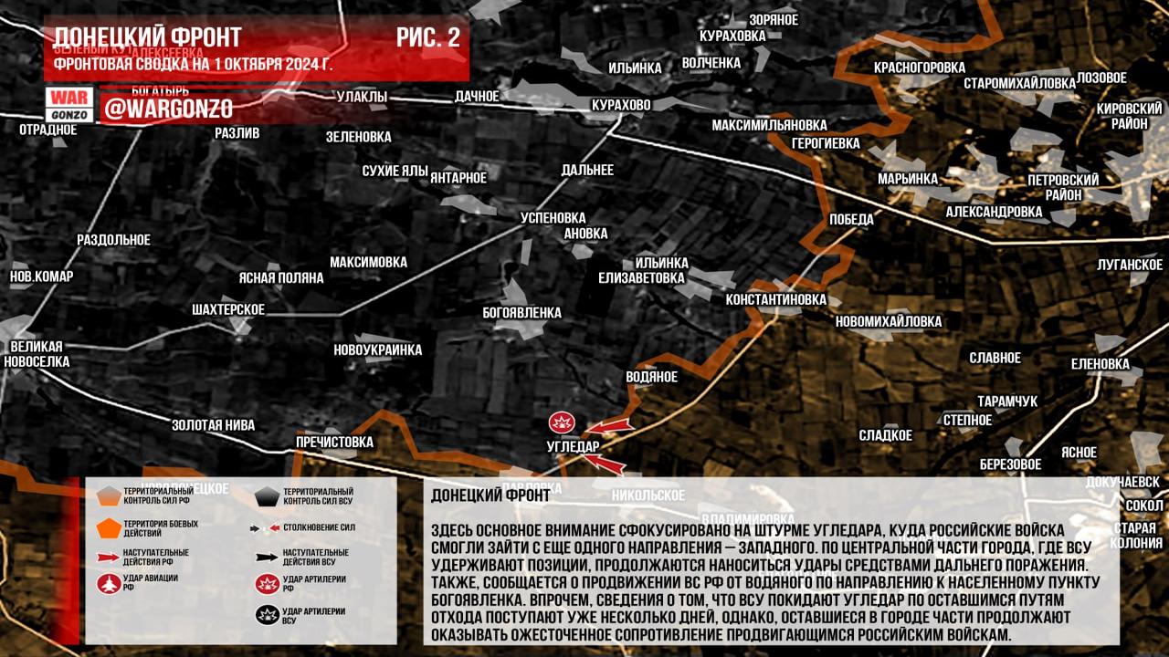 Ситуация на 01.10.2024 08:17. Канал Wargonzo сообщает: На утро 01.10.2024 ситуация на фронте остаётся стабильной, без существенных изменений. На Запорожском фронте бои носят позиционный характер, активно используются средства дальнего поражения. На Донецком фронте российские войска сосредоточены на штурме Угледара, где продолжаются удары по позициям ВСУ. Сообщается о продвижении ВС РФ от Водяного к Богоявленке, несмотря на ожесточенное сопротивление украинских сил в Угледаре. Селидово может оказаться в окружении из-за наступления российских войск с севера и юга. На часовоярском направлении активность снизилась, российские войска пытаются улучшить позиции на флангах. В Харьковской области боевые действия продолжаются, ВКС РФ наносят удары по Волчанску. В Курской области восстановлен контроль российских войск на участке границы, ВСУ продолжают атаки в районе Весёлого, но без успеха, сообщается о уничтоженной украинской бронетехнике.