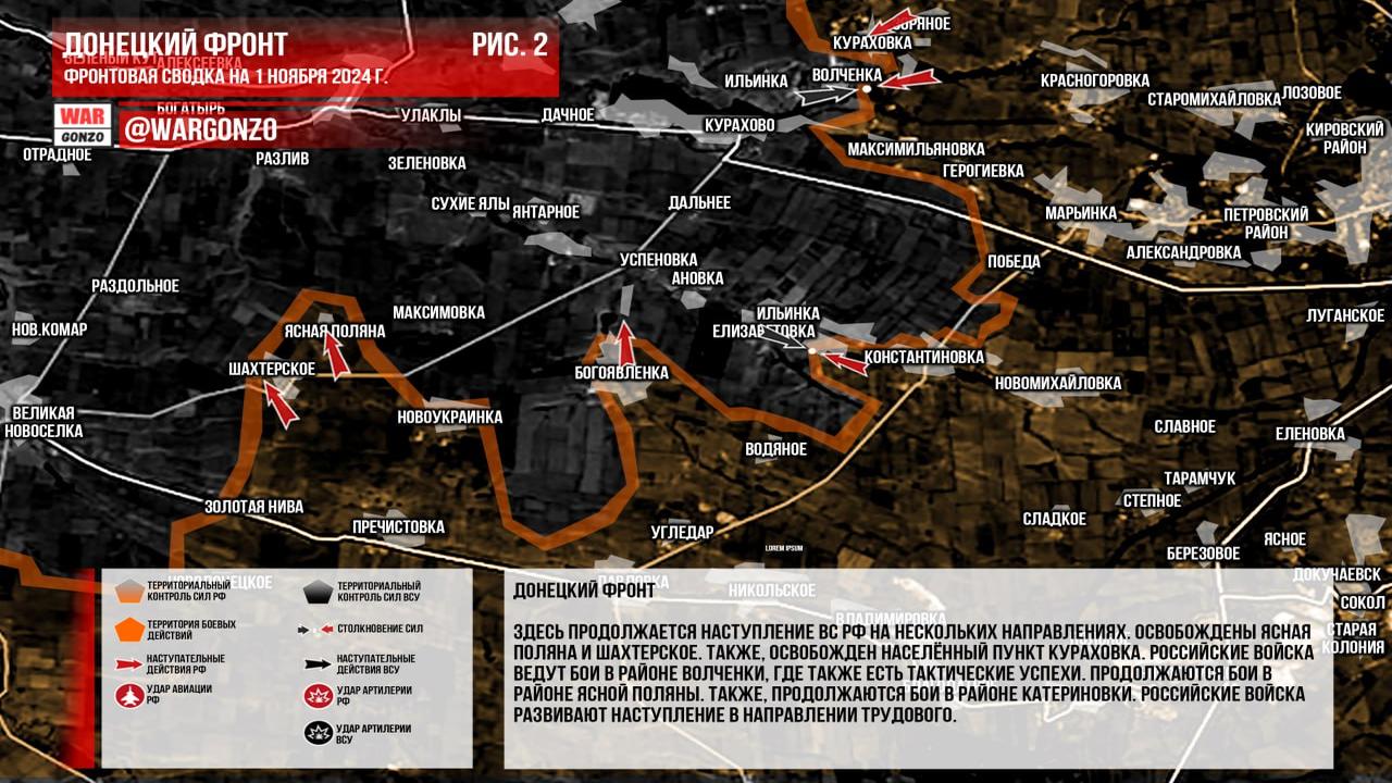 Ситуация на 01.11.2024 08:17. Канал Wargonzo сообщает: Фронтовая сводка на утро 01.11.2024. На Запорожском фронте продолжаются позиционные бои без существенных изменений. На Донецком фронте отмечено наступление ВС РФ с освобождением Ясной Поляны, Шахтерского и Кураховки, а также бои в районе Волченки с тактическими успехами. На Часовоярском направлении российские войск продолжают бои в городской черте, улучшая позиции, но без серьезных изменений. В Курской области продолжаются встречные бои, с подготовкой к активным штурмовым действиям и работой средств дальнего поражения по позициям ВСУ.