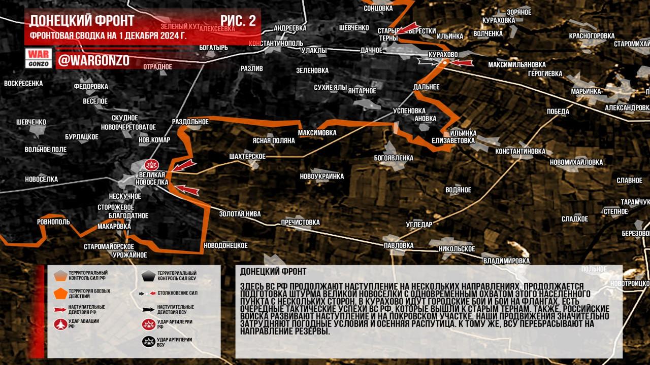 Ситуация на 01.12.2024 09:15. Канал Wargonzo сообщает: Фронтовая сводка на утро 01.12.2024 указывает на отсутствие существенных изменений на Запорожском фронте, где продолжаются позиционные бои и активная работа средств дальнего поражения. На Донецком фронте ВС РФ ведут наступление на нескольких направлениях, готовятся к штурму Великой Новоселки и продолжаются бои в Курахово с тактическими успехами, особенно вблизи Старых Терн. Боевым действиям мешают погодные условия и перемещение резервов ВСУ. В Часов Яре продолжаются городские бои, российские войска оказывают давление на противника, ведется работа на флангах. В Курской области за сутки изменений нет, продолжаются накаты на позиции ВСУ и их контратаки на нескольких участках.