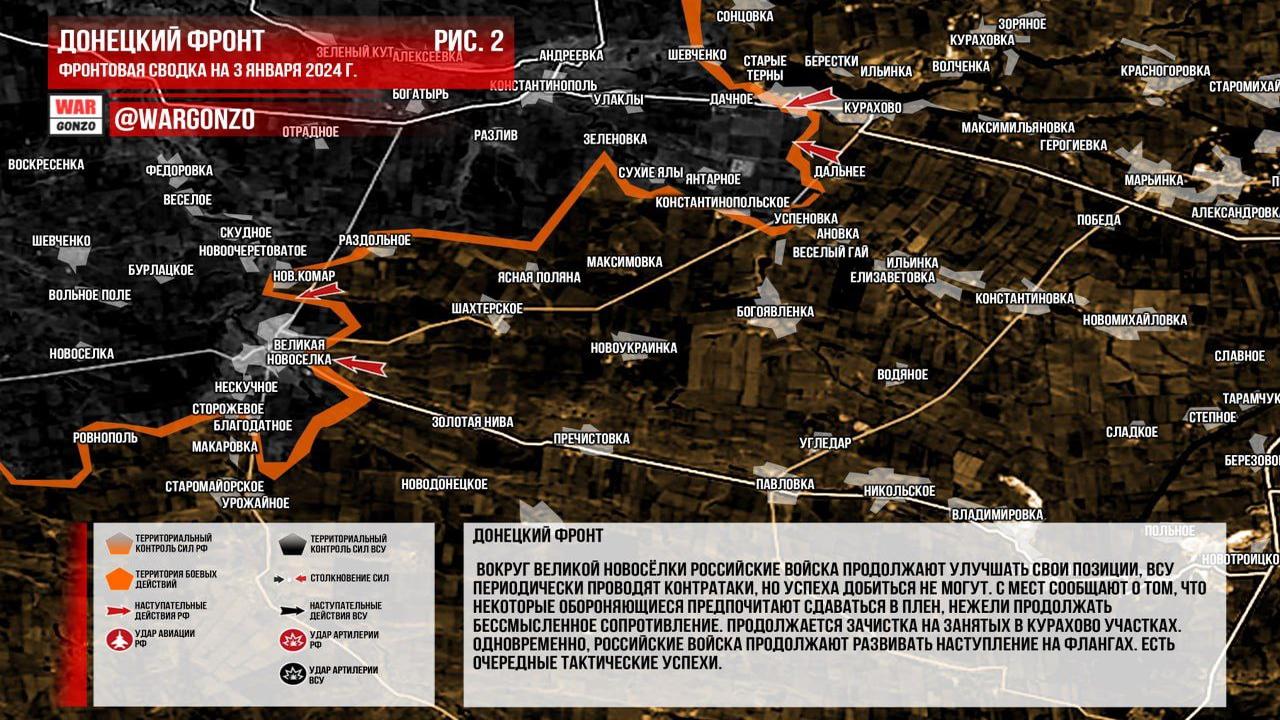 Ситуация на 03.01.2025 10:07. Канал Wargonzo сообщает: Фронтовая сводка за утро 03.01.2025. На Запорожском фронте отмечается активность российских войск севернее Вербового в районе Белогорья, однако информации о тактических успехах нет. На Донецком фронте возле Великой Новосёлки российские войска продолжают укреплять свои позиции, несмотря на периодические контратаки ВСУ, которые не приносят успеха. Некоторые защитники избирают сдачу в плен вместо продолжения сопротивления. Также происходит зачистка занятых участков в Курахово, и российские войска продолжают наступление на флангах, добиваясь тактических успехов. На Часовоярском направлении ВСУ атакуют в районе завода, пытаясь вернуть контроль, в то время как российские войска наблюдают за противником и продолжают давление. В Курской области российские войска атакуют позиции ВСУ, которые отвечают контратками, но полностью завладеть инициативой и прорвать фронт не удается из-за постоянного поступления резервов для ВСУ. Украинские усилия, включая ракетные удары по тыловым целям, не способны значительно изменить ситуацию, кроме как замедлить продвижение российских войск.