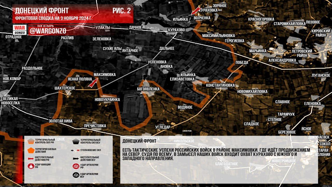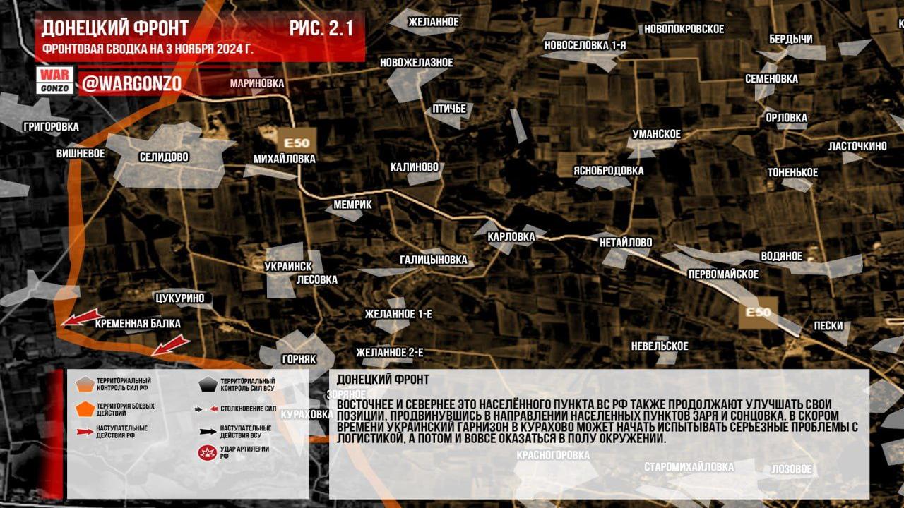 Ситуация на 03.11.2024 10:07. Канал Wargonzo сообщает: На утро 03.11.2024 имеются следующие данные с фронта. Запорожский фронт характеризуется позиционными боями без значительных изменений. На Донецком фронте отмечены тактические успехи российских войск в районе Максимовки, с продвижением на север и планами по охвату Курахово. Утверждается, что украинский гарнизон в Курахово может столкнуться с проблемами логистики и оказаться в полуокружении. На часовоярском направлении ведутся бои в городской черте, с целью улучшения позиций и контроля путей подвозов ВСУ. В Курской области значительных изменений нет, но ожидается новая фаза наступления с целью освобождения территории от ВСУ.