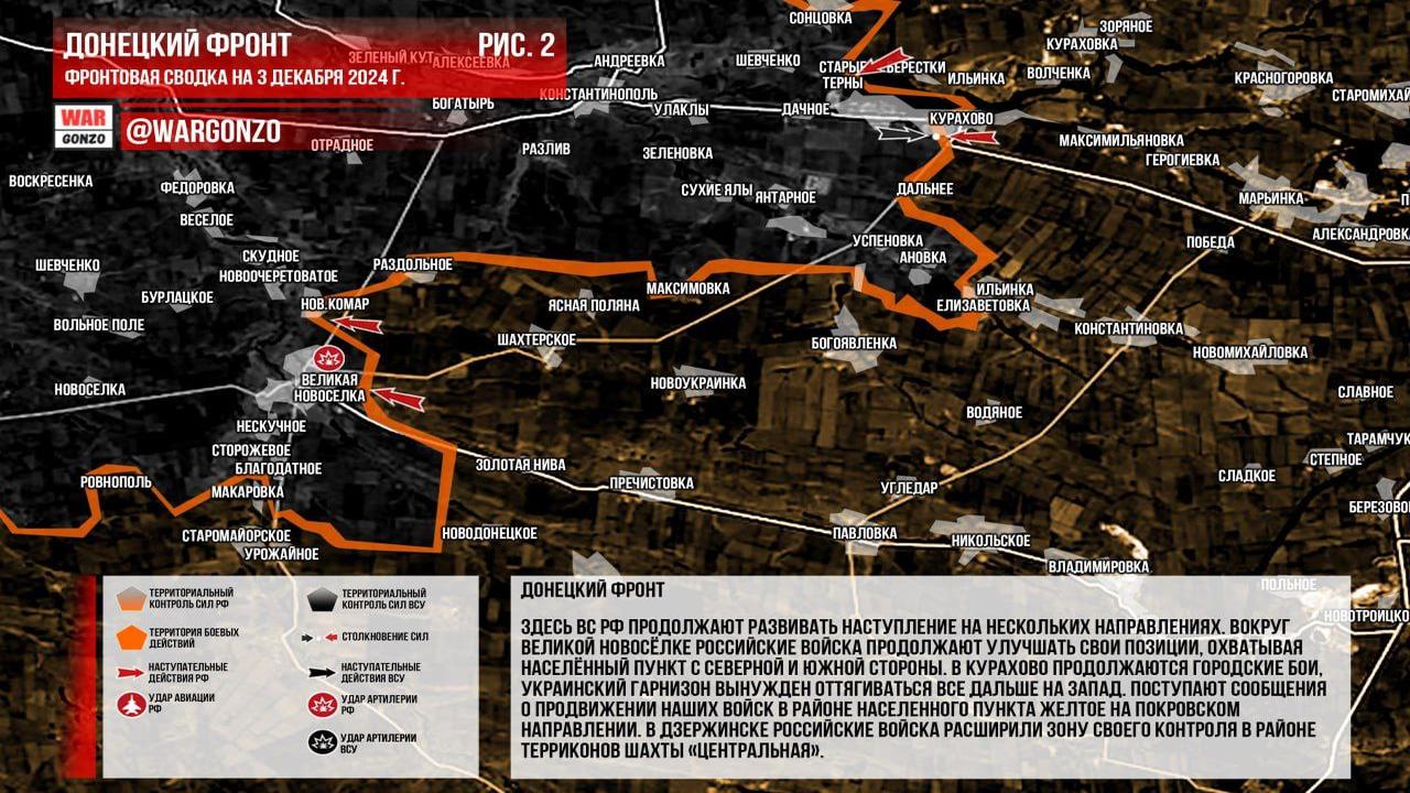 Ситуация на 03.12.2024 08:17. Канал Wargonzo сообщает: на утро 03.12.2024 зафиксированы боевые действия на различных фронтах. На Запорожском фронте бои носят позиционный характер без существенных изменений. На Донецком фронте российские войска продолжают наступление, улучшая позиции вокруг Великой Новосёлки и ведя городские бои в Курахово, где украинский гарнизон отступает на запад. Сообщается о продвижении российских войск в районе Желтого на Покровском направлении и расширении контроля в Дзержинске. На Часовоярском направлении бои продолжаются без значительных изменений. В Курской области происходят ожесточённые встречные бои, где ВСУ оказывают упорное сопротивление, но не достигают успеха.