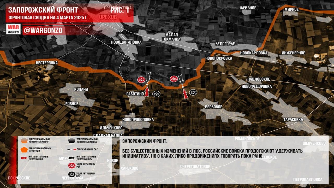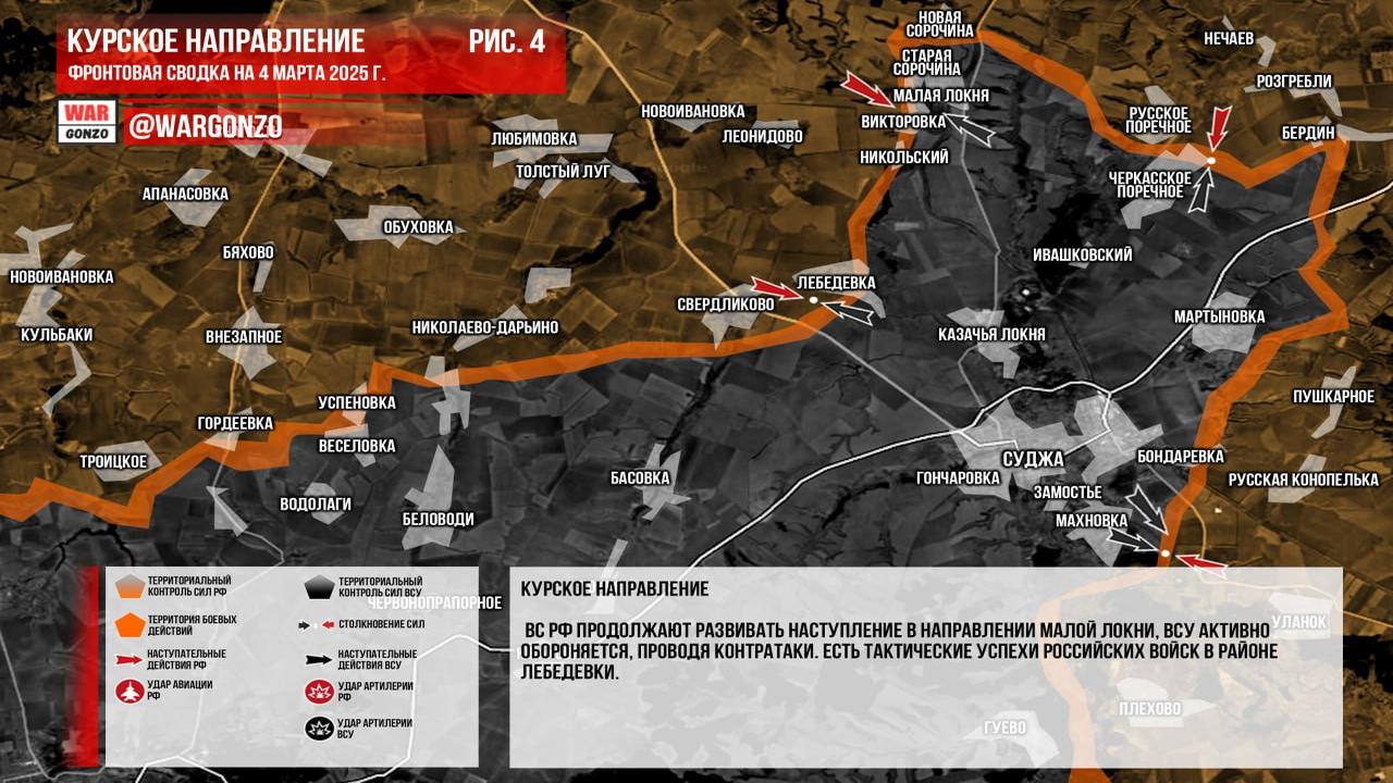Канал Wargonzo сообщил, что на утро 04.03.2025 ситуация на фронте выглядит следующим образом: