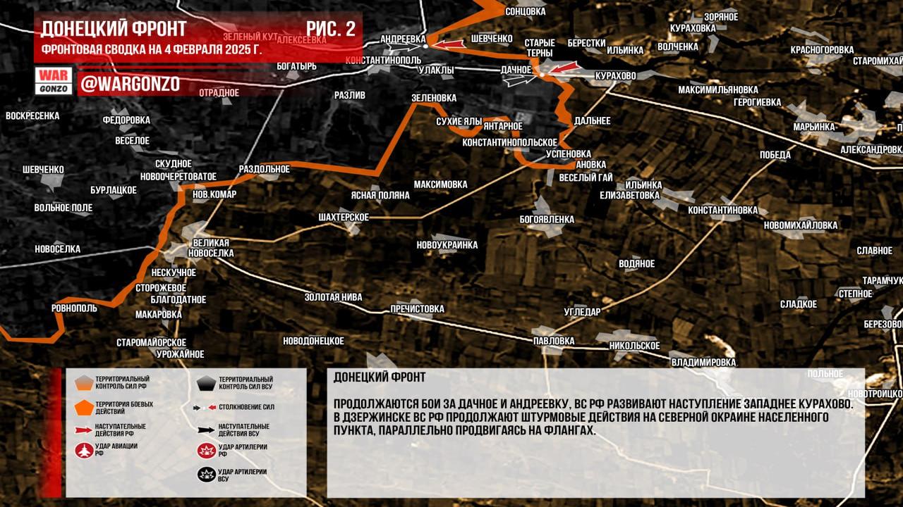 Ситуация на 05.02.2025 08:18. Канал Wargonzo сообщает: на утро 05.02.2025 продолжаются боевые действия на Запорожском фронте, однако ситуации глобально не изменились. На Донецком фронте происходят бои за Дачное и Андреевку, также отмечается наступление российских войск западнее Курахово и штурмовые действия в Дзержинске. В Часовоярском направлении российские войска захватили контроль над первым цехом Огнеупорного завода и продолжают продвигаться к району «Шевченко». В Курской области российские силы продолжают давление на оборону ВСУ на нескольких участках.