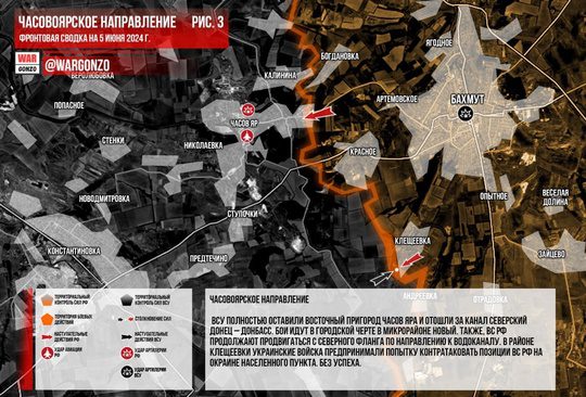 На Часовоярском направлении украинские войска покидают восточный пригород Часов Яра и отходят за канал. Бои идут в микрорайоне Новый. Российские войска продолжают продвигаться со северного фланга к водоканалу. В районе Клещеевки украинские попытки контратаки результатов не приводят.