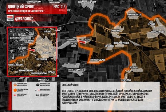 На Карловском направлении идут ожесточенные бои. ВСУ оказывают сопротивление, но ВС РФ все же добиваются тактических успехов. В Евгеновке российские войска занимают часть населенного пункта после успешных штурмов. В районе Нью-Йорка также наблюдается продвижение российских войск, которые занимают высоты и продвигаются к окраинам населенного пункта.