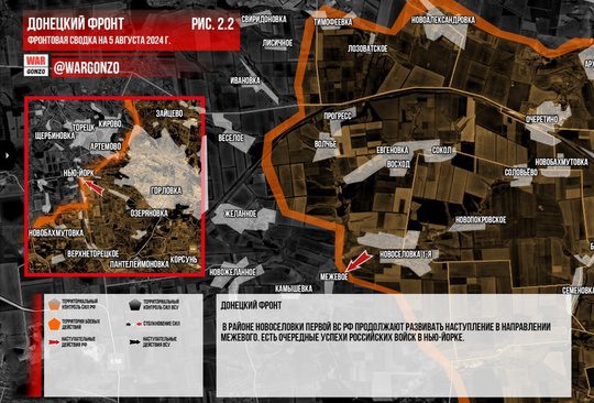 На Запорожском фронте продолжаются бои, которые в основном имеют позиционный характер. С обеих сторон активно используются средства дальнего поражения. Два успешных рывка на флангах террикона шахты имени Артема возможны благодаря отсутствию активного противодействия противника. Возможно, украинские войска просто не успели занять позиции на терриконе из-за стремительности наступления российских войск в Железном. Или же позиции противника были подавлены русской артиллерией. После захвата террикона шахты имени Артема ситуация для гарнизона ВСУ в Нью-Йорке станет критической, так как их единственный путь в южные кварталы Торецка будет под огнем. Это делает попытку прорыва для украинской армии чрезвычайно опасной.