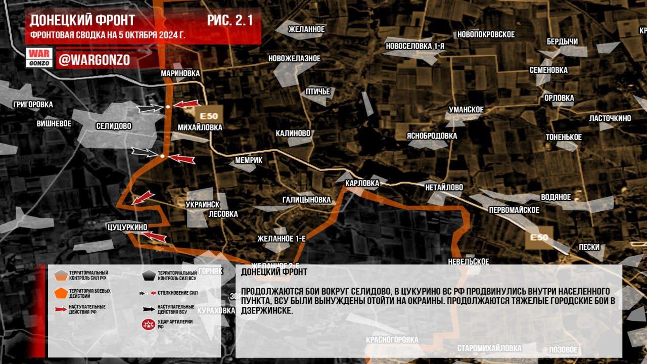 Ситуация на 05.10.2024 10:07. Канал Wargonzo сообщает: на утро 05.10.2024 в сводке фронтовой ситуации отмечено, что на Запорожском фронте изменений нет, активно действуют средства дальнего поражения. На Донецком фронте российские войска развивают наступление в направлении Богоявленки и Водяного, фиксируются продвижения в районе Островского и тяжелые бои в Дзержинске. В Часовоярском направлении значительных изменений не наблюдается, продолжаются бои в восточной части Часов Яра. На Харьковском фронте линия фронта остается статичной, фиксируются бои в Волчанске. В Курской области продолжаются встречные бои в Суджанском районе, украинские войска оказывают сопротивление.