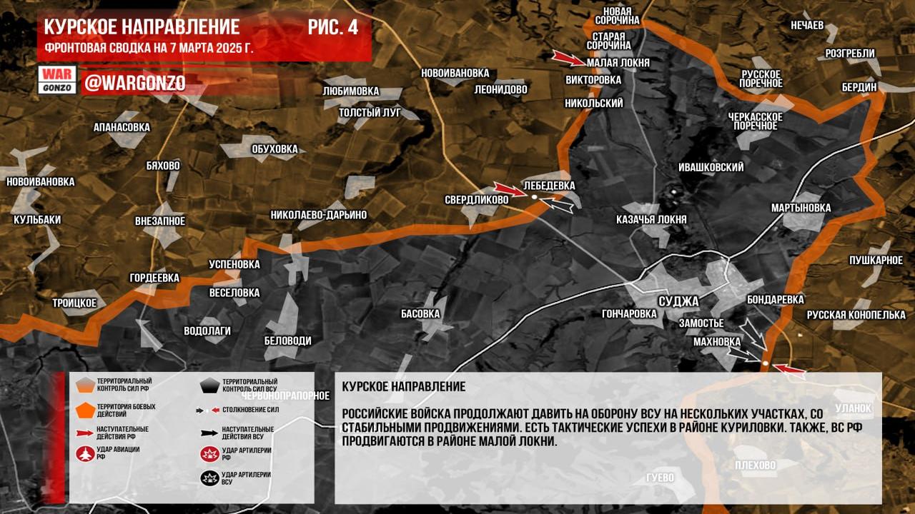 Юрий Подоляка сообщил о ситуации на Курском направлении на 16 часов 07.03.25. Он отметил, что в результате боевых действий над рядом населенных пунктов, таких как Старая Сорочина и Николаевка, подняты российские флаги. Противник, по его словам, покидал позиции без значительного сопротивления, так как уничтожение мостов значительно ухудшило их снабжение и боевой дух. Юрий Подоляка написал, что российские штурмовики продолжают операции в Викторовке, откуда противник уже уходит, а также начали бои за Малую Локню. Он добавил, что согласно данным аэроразведки, противник также начинает отходить из «северного» кармана на Казачью Локню, что может повлиять на их удержание позиции в Малой Локне.