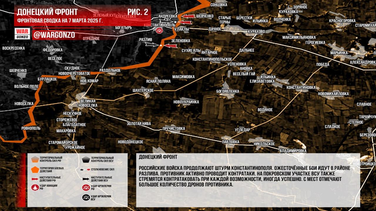 Канал Wargonzo отметил, что на Донецком фронте российские войска ведут штурм Константинополя, особенно в районе Разлива, где идут ожесточенные бои и активные контратаки противника. Также на Покровском участке ВСУ регулярно осуществляют контратаки, иногда с успехом, что сопровождается большим количеством дронов со стороны противника.