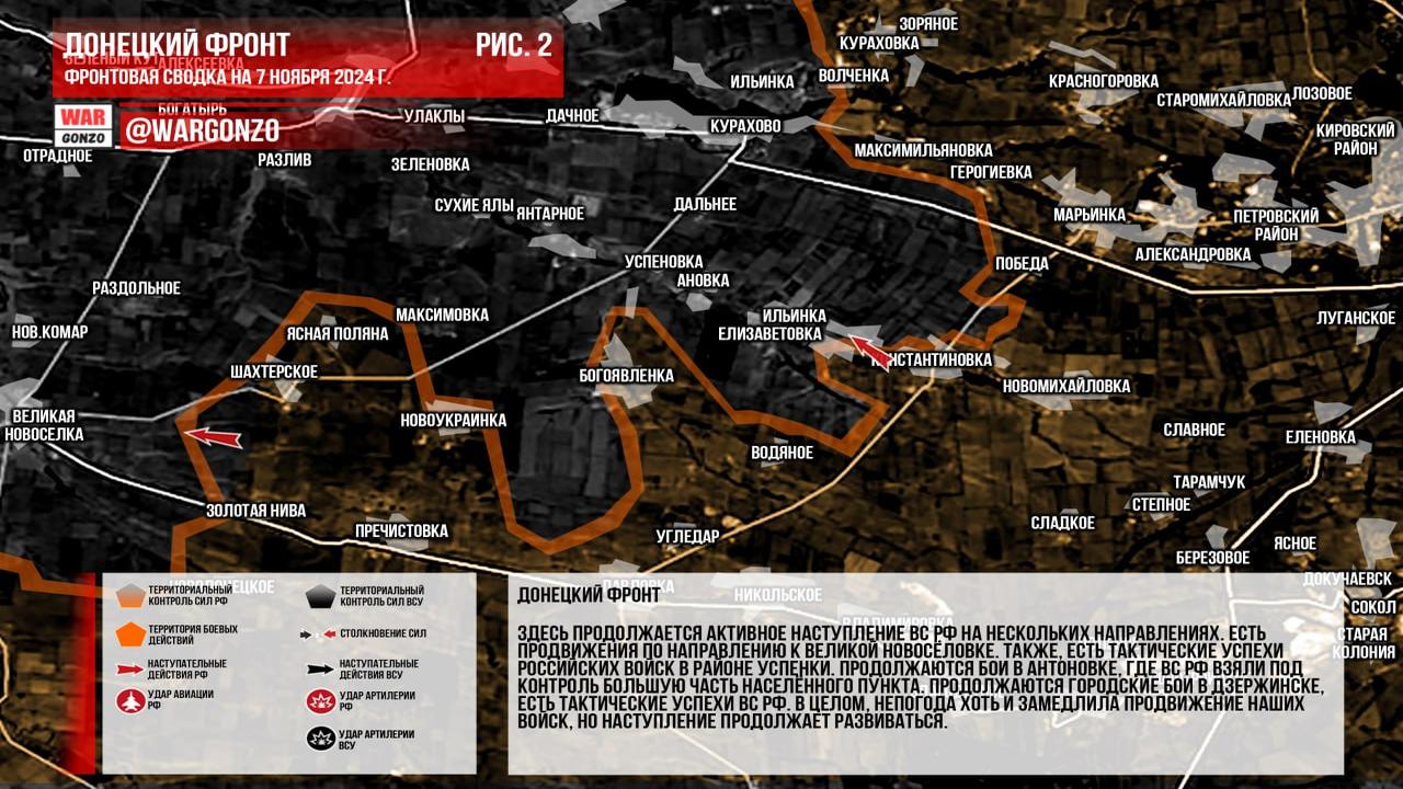 Ситуация на 07.11.2024 08:26. Канал Wargonzo сообщает: Фронтовая сводка на утро 07.11.2024 отмечает, что на Запорожском фронте без существенных изменений, продолжаются позиционные бои с применением дальнобойного оружия. На Донецком фронте продолжается активное наступление ВС РФ, с продвижениями к Великой Новосёловке и тактическими успехами в районе Успенки. В Антоновке российские войска контролируют большую часть населённого пункта, а в Дзержинске продолжаются городские бои с тактическими успехами ВС РФ. Непогода замедляет продвижение, но наступление продолжается. На Часовоярском направлении российские войска улучшают свои позиции, бои в городе носят позиционный характер. В Курской области без существенных изменений, продолжаются встречные бои, при этом средства дальнего поражения ВС РФ активно работают по позициям и логистике ВСУ.