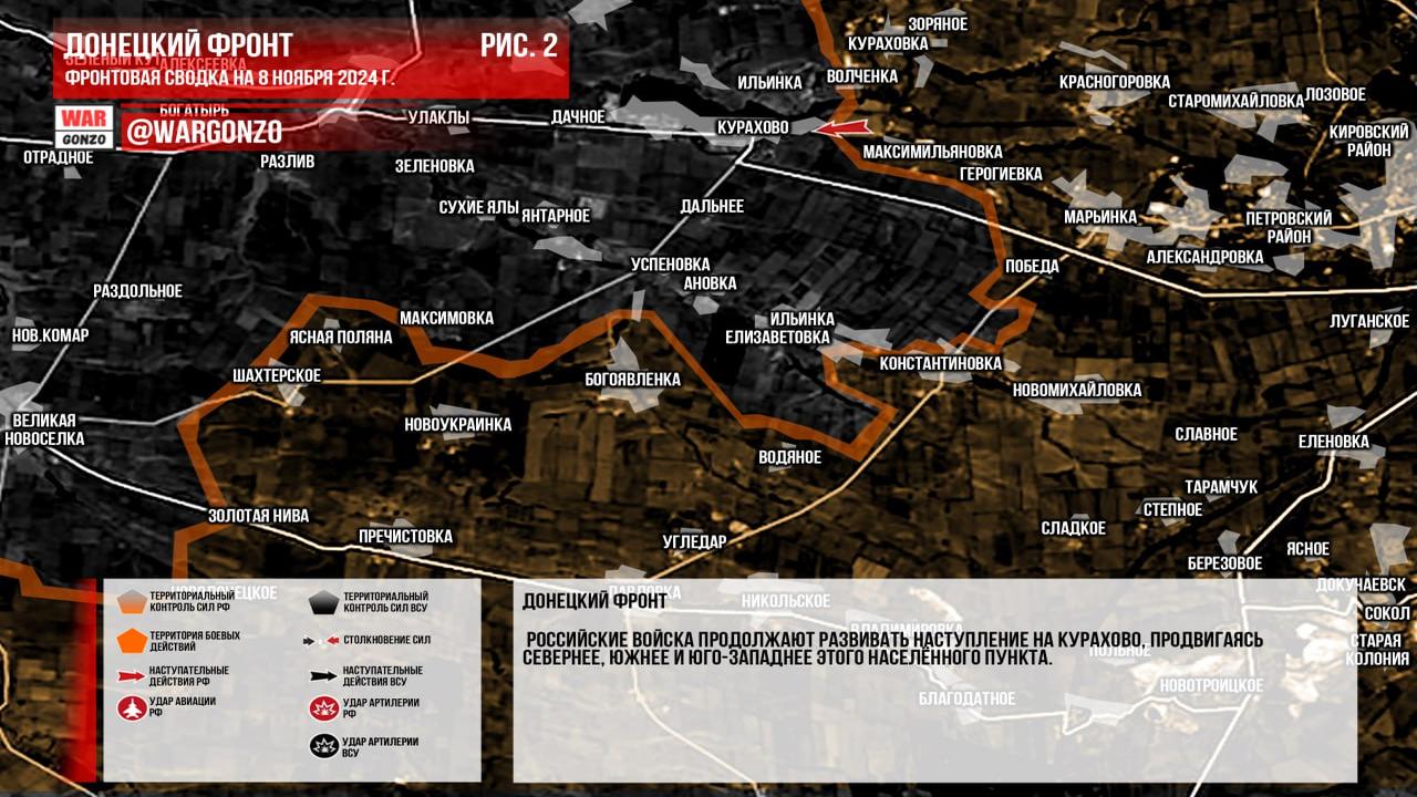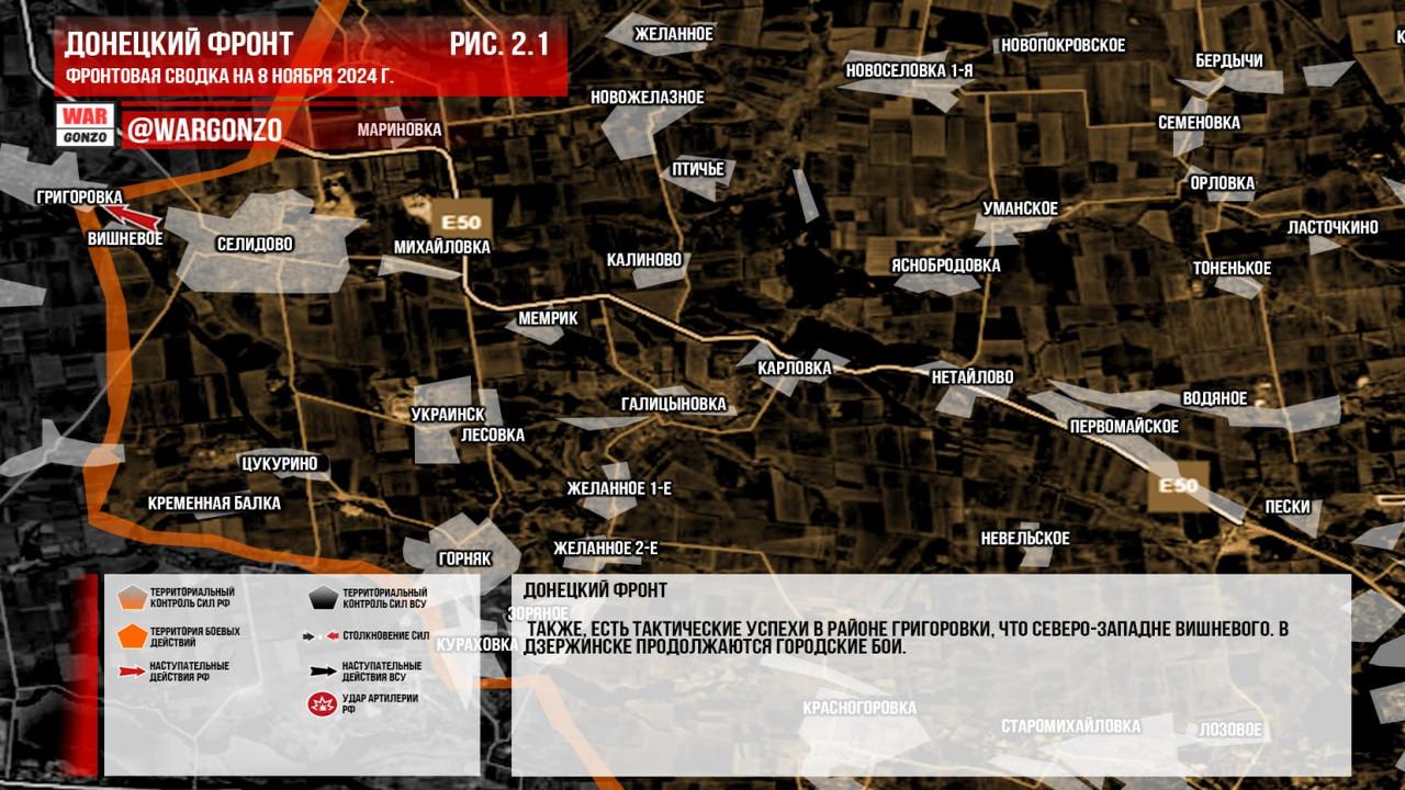 Ситуация на 08.11.2024 08:26. Канал Wargonzo сообщает: Фронтовая сводка на утро 08.11.2024. Сообщил о тактических успехах ВС РФ в районе Нестерянки, где под контроль российских войск перешло несколько позиций ВСУ. На Донецком фронте отмечено продолжение наступления на Курахово с продвижением в северном, южном и юго-западном направлениях. Также сообщается о тактических успехах в районе Григоровки. В Дзержинске продолжаются городские бои. На Часовоярском направлении изменений не зафиксировано, российские войска продолжают укреплять позиции на флангах, при этом бои продолжаются в городе. В Курской области продолжаются встречные бои на нескольких участках, без серьезных изменений в линии боевого соприкосновения.