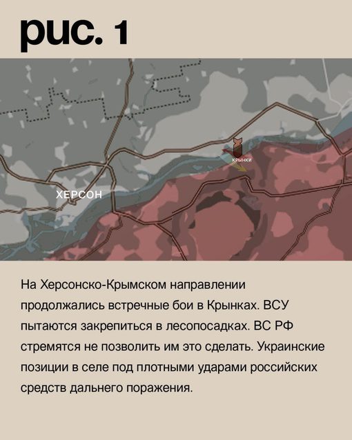 На Херсонском направлении противник, в районе Крынок, предпринимает несколько попыток продвижения вглубь территории. Несмотря на то, что все атаки со стороны украинских вооруженных сил были отражены, противнику удалось незначительно расширить зону контроля в селе, постоянно компенсируя потери через ротацию войск.