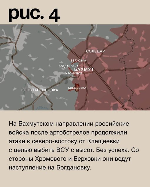 На Бахмутском направлении российские войска, после артиллерийских обстрелов, продолжают атаки к северо-востоку от Клещеевки с целью вытеснить украинские вооруженные силы с высот. Однако, их попытки не приводят к успеху. Кроме того, они также ведут наступление на Богдановку со стороны Хромового и Берховки.