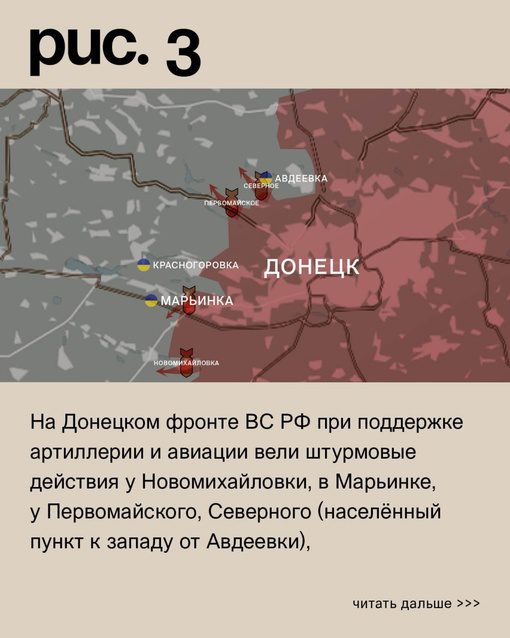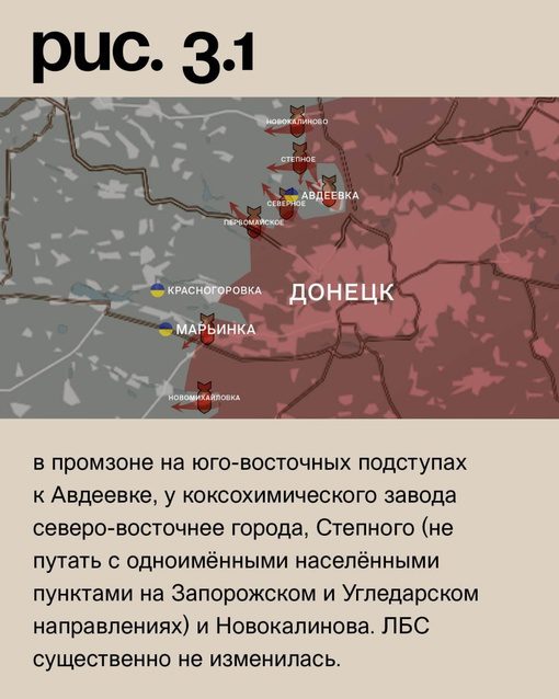 На Донецком фронте российские вооруженные силы, с поддержкой артиллерии и авиации, осуществляют штурмовые действия в различных районах. Они проводят атаки у Новомихайловки, в Марьинке, у Первомайского, Северного (населенный пункт к западу от Авдеевки), в промышленной зоне на юго-восточных подступах к Авдеевке, у коксохимического завода северо-восточнее города, а также в Степном (не путать с одноименными населенными пунктами на Запорожском и Угледарском направлениях) и Новокалинове. Ситуация на линии фронта остается неизменной.