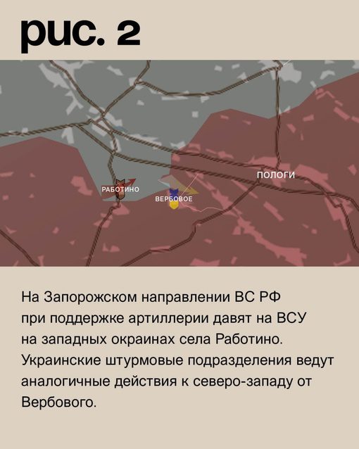 В районе села Работино на Запорожском направлении российские вооруженные силы, получая поддержку артиллерии, активно давят на украинские вооруженные силы, которые находятся на западных окраинах этого населенного пункта. В то же время, украинские штурмовые подразделения проводят аналогичные действия к северо-западу от Вербового.
