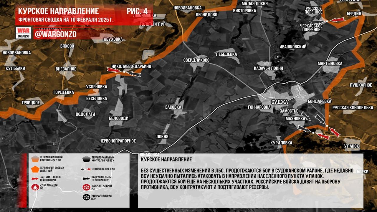 Ситуация на 10.02.2025 08:18. Канал Wargonzo сообщает: Фронтовая сводка на утро 10.02.2025. В Запорожском фронте без существенных изменений в линии боевого соприкосновения, бои носят позиционный характер с активной работой средств дальнего поражения с обеих сторон. На Донецком фронте российские войска продолжают наступление в направлении Константинополя, бои продолжаются в районе Дачного и Андреевки, в то время как ВСУ пытаются провести контратаки на Покровском направлении, не добившись серьезных результатов. В Часовоярском направлении происходят бои в Часов Яре, где зафиксированы тактические успехи российской армии. В Курской области также без существенных изменений в линии боевого соприкосновения, продолжаются бои в Суджанском районе, где ВСУ неудачно пытались атаковать населённый пункт Уланок, а российские войска продолжают давить на оборону противника, в то время как ВСУ проводят контратаки и подтягивают резервы.