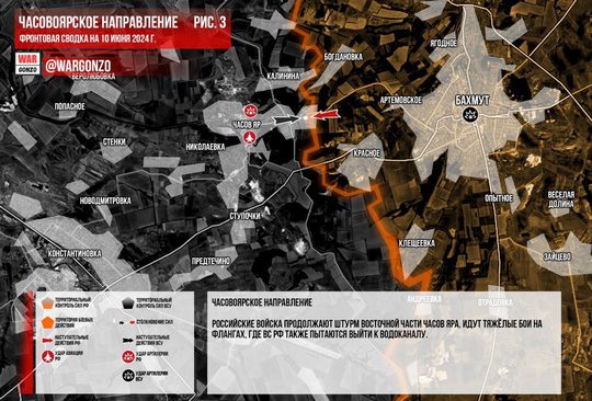В окрестностях Часова Яра и в лесах рядом с ними, а также в районе Андреевки, идут бои между российскими и украинскими войсками на Артемовском направлении.