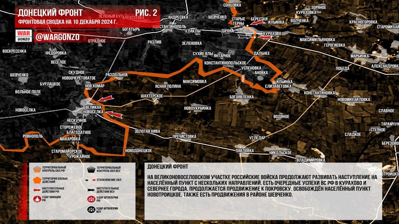 Ситуация на 10.12.2024 08:16. Канал Wargonzo сообщает: Фронтовая сводка на утро 10.12.2024 сообщила о ситуации на фронте. На Запорожском фронте отмечены позиционные бои с активным использованием дальнобойных средств обеими сторонами. На Донецком фронте российские войска продолжают наступление на Великоновоселовском участке и добиваются успехов в Курахово и севернее города, а также продвигаются к Покровску. Освобождён населённый пункт Новотроицкое с продвижениями в районе Шевченко. В Часовоярском направлении бои в Часов Яре продолжаются, но без существенных изменений. В Курской области освобождён населённый пункт Плехово, при этом ВСУ активно перебрасывает личный состав и технику на этом направлении.