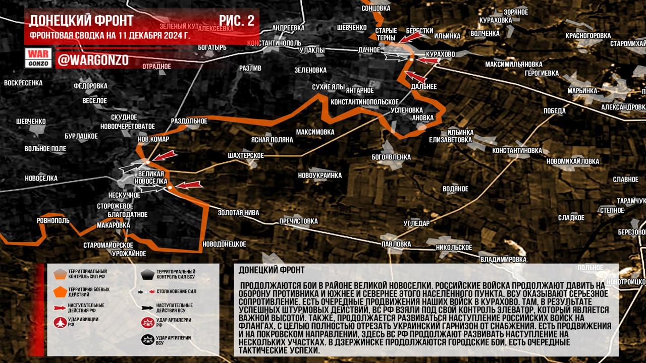 Ситуация на 11.12.2024 08:30. Канал Wargonzo сообщает: фронтовая сводка на утро 11.12.2024. В Запорожском фронте продолжаются позиционные бои с использованием средств дальнего поражения, существенных изменений в линии боевого соприкосновения не наблюдается. На Донецком фронте отмечаются бои в районе Великой Новоселки, где российские войска продолжают давление на оборону противника, а ВСУ оказывают серьезное сопротивление. Сообщаются о продвижениях российских войск в Курахово, где взят под контроль важный элеватор, а также продолжается наступление на флангах с целью отрезать украинский гарнизон от снабжения. На Покровском направлении российские войска развивают наступление на нескольких участках, в Дзержинске продолжаются городские бои с тактическими успехами. В Часов Яре также продолжаются городские бои, российские войска смогли зайти на территорию огнеупорного завода.