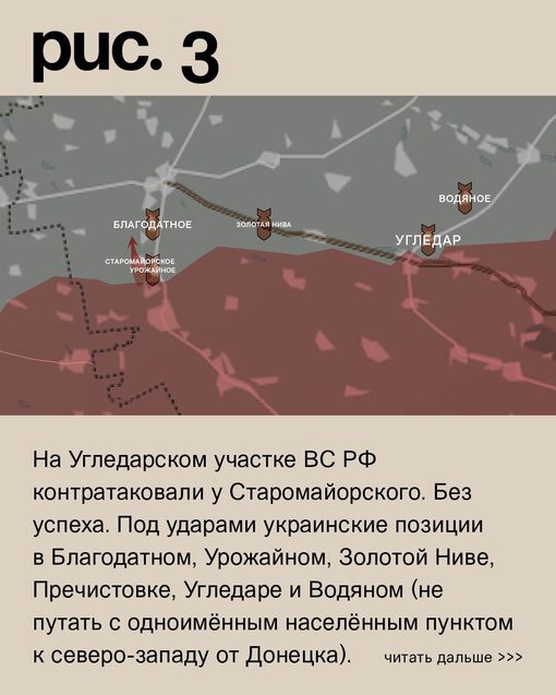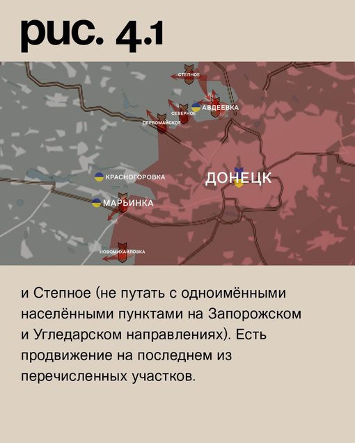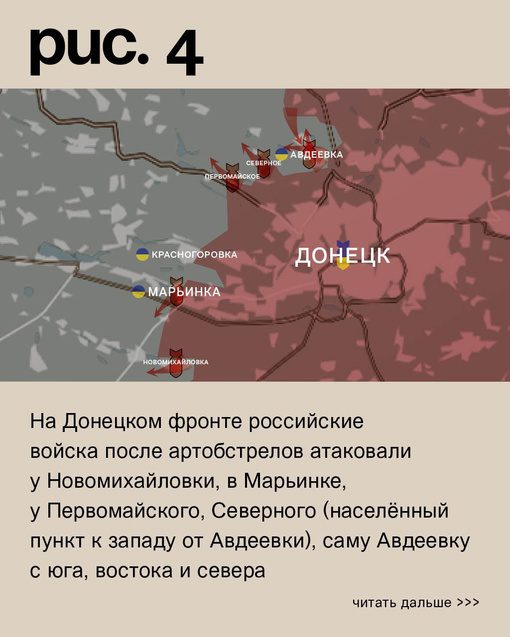 На Авдеевском участке продолжаются ожесточенные бои в районе Степового, в окрестностях которого ранее удалось проникнуть российским войскам. Пока рано говорить о том, что ВС РФ закрепились в селе, но бойцы все больше действуют на запад от железной дороги в этой области. Ситуация на южном фланге остается неизменной.