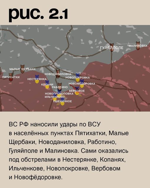 На Запорожском направлении ВСУ с поддержкой артиллерии атаковали у Новопрокоповки и в районе Пшеничного. На втором участке было небольшое продвижение. ВС РФ проводили атаки по ВСУ в населенных пунктах Пятихатки, Малые Щербаки, Новоданиловка, Работино, Гуляйполе и Малиновка. Сами российские силы оказались под обстрелом в Нестерянке, Копанях, Ильченкове, Новопокровке, Вербовом и Новофедоровке.