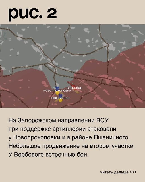 На Запорожском направлении русская армия атаковала на запад от Работино на Ореховском участке. В то же время ВСУ временно сумели продвинуться у Новопрокоповки и к северо-западу от Вербового. В районе Старомайорского и Новодонецкого нашим бойцам удалось наступить на Времевском выступе.