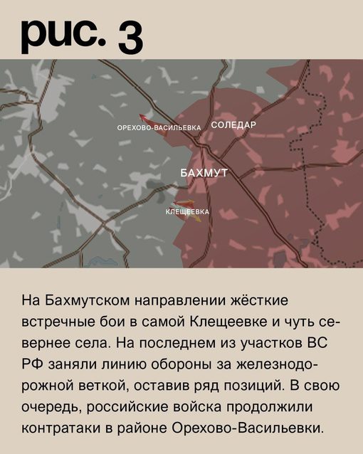 На Луганском направлении российские военные ведут активные операции к западу от Новосёловского, однако Вооруженные Силы Украины успешно удерживают свои позиции. В ходе боевых действий российские войска нанесли удары по украинским подразделениям в Белогоровке, Макеевке, Новоегоровке, Ивановке и Синьковке. В настоящее время в районе последнего населенного пункта отмечается относительное затишье. На Сватово-Кременном направлении российские военные продолжают расширять зону контроля у Синьковки и Петропавловки под Купянском. Они успешно отразили все атаки Вооруженных Сил Украины как в Серебрянском лесу, так и в Торском. В Клещеевке на Бахмутском направлении продолжаются ожесточенные бои. Согласно информации, полученной из источника Readovka, село уже почти полностью разрушено, что способствует активным боевым действиям. Вооруженные Силы Украины массово применяют кассетные снаряды и дроны-камикадзе. Также идут бои на юге Андреевки, которая в настоящее время находится в серой зоне. На Бахмутском направлении происходят жесткие столкновения в самой Клещеевке и немного севернее села. Российские военные заняли линию обороны за железнодорожной веткой, оставив некоторые позиции. В ответ российские войска проводят контратаки в районе Орехово-Васильевки.Военные карты