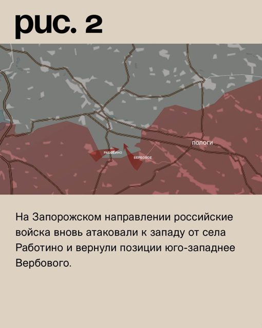 На Запорожском направлении российские войска снова атаковали к западу от села Работино и вернули позиции юго-западнее Вербового.