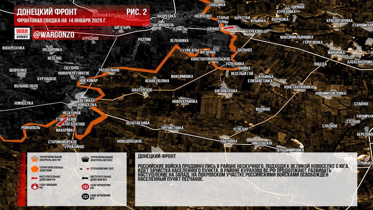 Ситуация на 14.01.2025 08:25. Канал Wargonzo сообщает: Фронтовая сводка на утро 14.01.2025 описывает текущее положение на фронтах. На Запорожском фронте отмечаются без существенных изменений, с позиционными боями и активной работой средств дальнего поражения. На Донецком фронте российские войска продвинулись в районе Нескучного к Великой Новоселке и продолжают наступление на запад в Курахово, освободив Песчаное. В Часовоярском направлении бои за огнеупорный завод продолжаются, при этом сообщения о полном оставлении противником территории преждевременны. В Курской области российские войска пытаются выбить ВСУ с занятых позиций, но активные оборона и контратаки украинских войск замедляют продвижение. Ситуация вернулась к условиям конца прошлого года, украинские войска подтягивают резервы для удержания позиций.