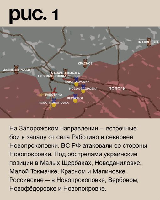 На Запорожском направлении происходили бои в окрестностях села Работино и Новопрокоповки. Российские вооруженные силы атаковали с направления Новопокровки, а украинские позиции оказались под обстрелом в нескольких населенных пунктах.