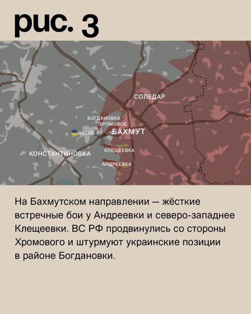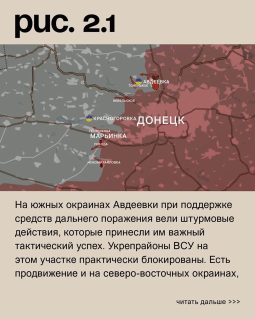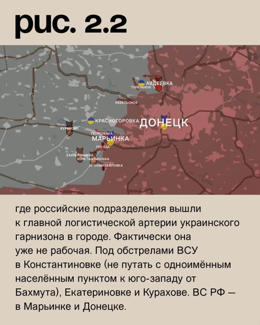 Также российские вооруженные силы продвигались на северо-восточные окраины, где они вышли к главной логистической артерии украинского гарнизона в городе. Эта артерия фактически перестала функционировать из-за находящихся в районе российских войск. А под обстрелами украинских вооруженных сил оказались населенные пункты Константиновка, Екатериновка и Курахово, а также российские подразделения воздействовали на Марьинку и Донецк.
