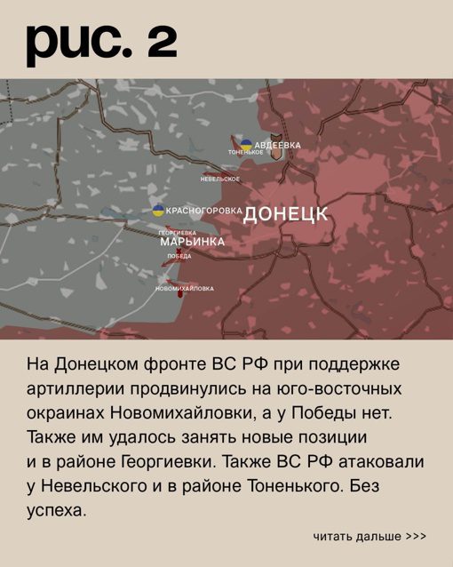 А на Донецком фронте российские вооруженные силы, поддерживаемые артиллерией, продвинулись на юго-восточные окраины Новомихайловки и Георгиевки. Они также атаковали у Невельского и в районе Тоненького, но без успеха. В южных окраинах Авдеевки российские подразделения использовали тяжелую артиллерию, чтобы вести штурмовые действия, которые принесли им важный тактический успех. Украинские укрепленные районы в этих местах практически полностью оказались блокированы.