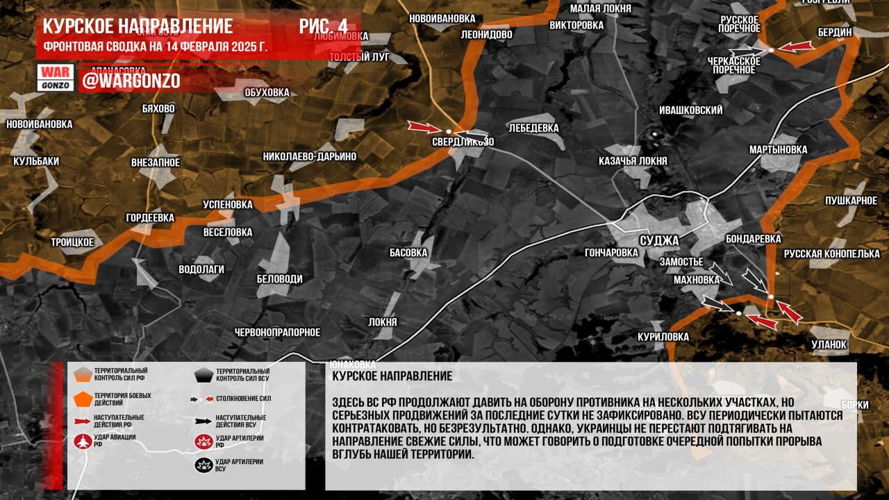 Ситуация на 14.02.2025 08:20. Канал Wargonzo сообщает: на утро 14.02.2025 ситуация на фронте следующая. На Запорожском фронте продолжаются позиционные бои, серьезных изменений в линии боевого соприкосновения не отмечено. На Донецком фронте российские войска продвигаются в Андреевке и занимаются зачисткой занятых рубежей, а также теснят противника в районе Дачного. ВСУ удерживают оборону, не позволяя значительно продвинуться. На Покровском участке сообщается о продвижении в Запорожье и освобождении Зеленого Поля. На Часовоярском направлении продолжаются интенсивные городские бои, где ВСУ активно используют дроны-камикадзе. В Курской области российские войска оказывают давление на оборону противника, но серьезных изменений за сутки не зафиксировано; украинская сторона подтягивает свежие силы, что может свидетельствовать о подготовке новых контратак.