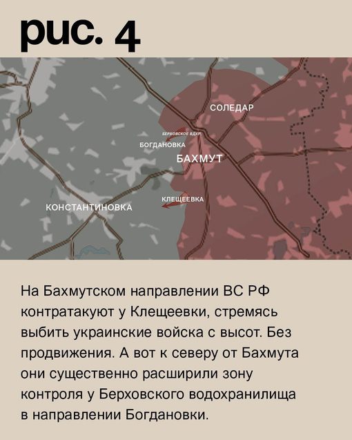 На Бахмутском направлении российские военные проводят контратаку у Клещеевки, пытаясь выбить украинские войска с высот. Однако, пока безуспешно. Однако, к северу от Бахмута они значительно расширили свою зону контроля у Берховского водохранилища в направлении Богдановки.