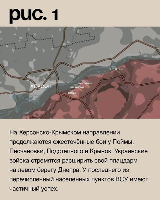 На Херсонско-Крымском направлении продолжаются ожесточенные бои у Поймы, Песчановки, Подстепного и Крынок. Украинские войска стремятся расширить свой плацдарм на левом берегу Днепра, и в некоторых из перечисленных населенных пунктов имеют частичный успех.