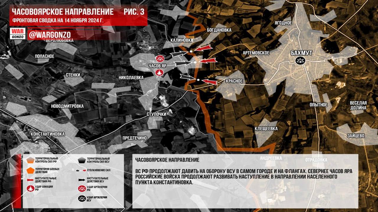 Ситуация на 14.11.2024 09:14. Юрий Подоляка сообщает: на утро 14.11.24, рассматривая ситуацию на ЧасовЯрском участке фронта, он отметил, что наши части смогли сбить противника с позиций в районе канала «Северский Донец-Донбасс» и занять преобладающие высоты. Он написал, что почти все высоты в этом районе перешли под наш контроль, что создает угрозу для Торецкой группировки противника. При дальнейшем продвижении возможно ухудшение ситуации для ВСУ. Также Подоляка отметил, что в самом Торецке наши части продолжают продвижение, что требует от командования ВСУ дополнительных усилий для ликвидации прорывов.»
