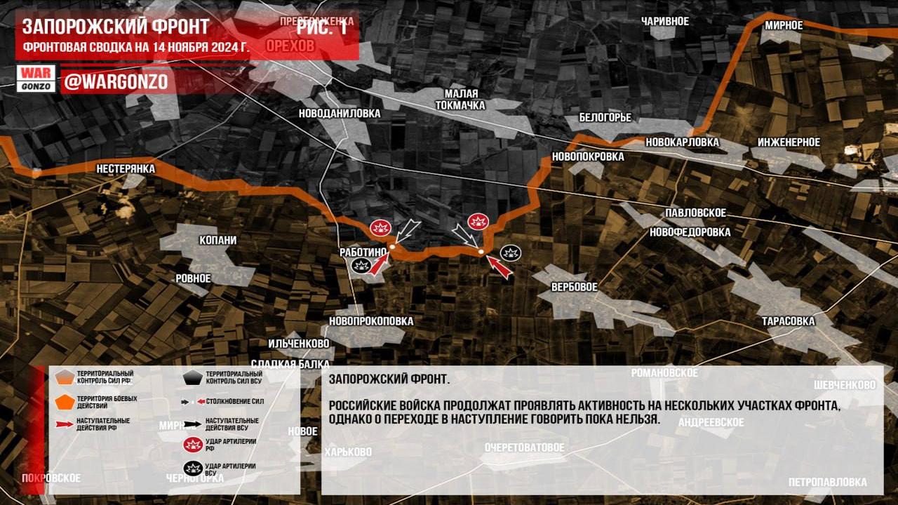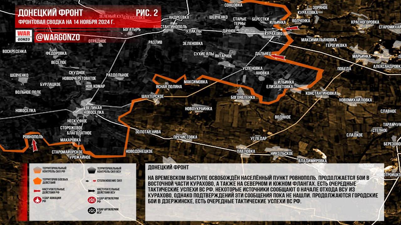 Ситуация на 14.11.2024 08:47. Канал Wargonzo сообщает: на утро 14.11.2024 о ситуации на фронте. В Запорожской области российские войска продолжают активность на нескольких участках, однако о наступлении речь не идет. На Донецком фронте освобождён населённый пункт Ровнополь, идут бои в восточной части Курахово и на флангах, есть тактические успехи ВС РФ, хотя информация о возможном отходе ВСУ из Курахово пока не подтверждена. В Дзержинске продолжаются городские бои, также отмечены успехи российских войск. В Часовоярском направлении российские войска оказывают давление на оборону ВСУ и развивают наступление к Константиновке. В Курской области ситуации остаётся стабильной, продолжаются ожесточённые бои, ВСУ вводят новые резервы, а российские силы наносят удары по позициям противника с использованием дальнобойных систем и авиации, включая Сумскую область.