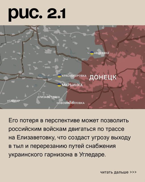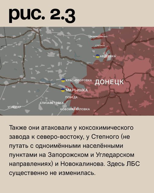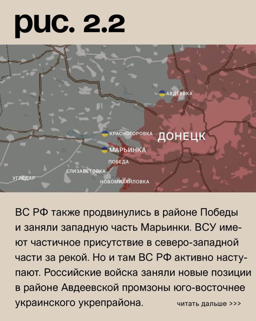 Российская армия также продвинулась в районе Победы и заняла западную часть Марьинки. Украинская армия имеет частичное присутствие в северо-западной части за рекой, но и там российская армия активно наступает.