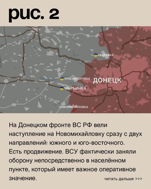 На Донецком фронте российская армия начала наступление на Новомихайловку одновременно с двух направлений: с юга и юго-востока. Они смогли продвинуться вперед. Украинская армия фактически заняла оборонительные позиции прямо в городе, который имеет важное стратегическое значение. Потеря этого города может позволить российским войскам продвигаться по трассе в Елизаветовку, что создаст угрозу для украинских войск в Угледаре и перережет их снабжение.