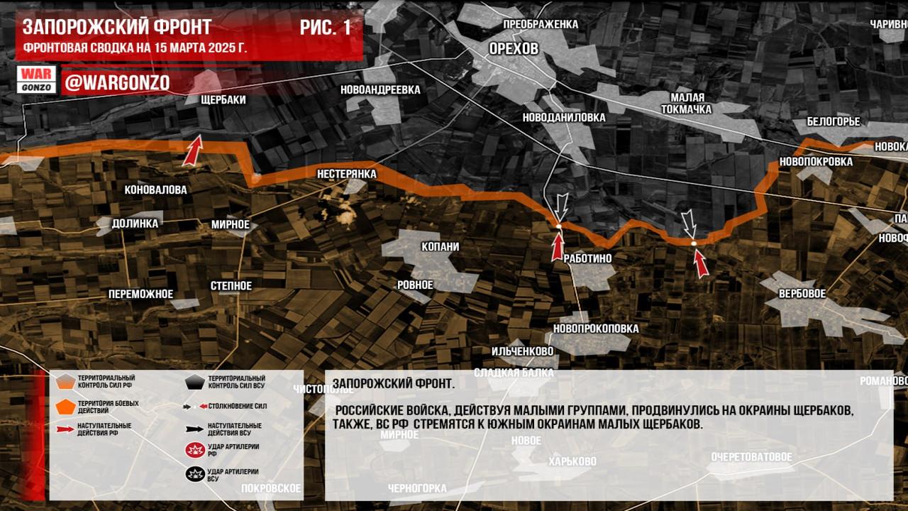 Канал Wargonzo сообщил, что на утро 15.03.2025 ситуация на фронте выглядит следующим образом. На Запорожском фронте российские войска продвинулись к окраинам Щербаков и направляются к южным окраинам Малых Щербаков. На Донецком фронте происходит наступление в районе Шевченко, где ВСУ перебрасывают резервы и проводят контратаки. Бои продолжаются в районе Вольного Поли, также отмечается движение российских войск к Весёлому и Разливу. На Покровском направлении ведутся встречные бои с контратакующими ВСУ. Канал Wargonzo отметил, что на Часовоярском направлении изменений в линии боевого соприкосновения нет, хотя активность боевых действий остается высокой. В Курской области российские войска продвинулись в районе Гуево и Рубанщины, что влияет на логистику ВСУ. Украинские войска отходят на территорию Сумской области, но хаотичное бегство остановлено. Противник старается занять выгодные позиции и наносит артиллерийские удары по своим оставленным позициям. Кроме того, верховный главнокомандующий предложил частям ВСУ, оказавшимся в окружении, сдаться, но ответа от них не последовало, что подразумевает возможность их уничтожения.