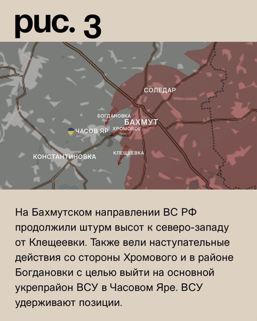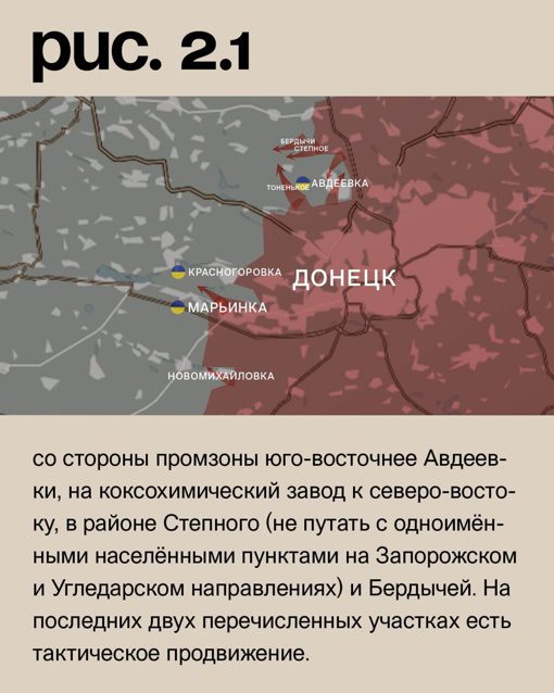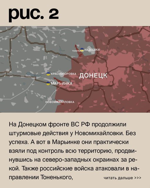 В то же время, на Донецком фронте российские вооруженные силы продолжают свои атаки. Однако их штурмовые действия у Новомихайловке завершились неудачей. С другой стороны, они почти полностью контролируют территорию в Марьинке, продвигаясь на северо-западные окраины за рекой. Также были атакованы Тоненькое, промзона юго-восточнее Авдеевки, коксохимический завод на северо-востоке, район Степного (не путать с одноименными населенными пунктами на Запорожском и Угледарском направлениях) и Бердычей. На последних двух участках удалось продвинуться тактически.