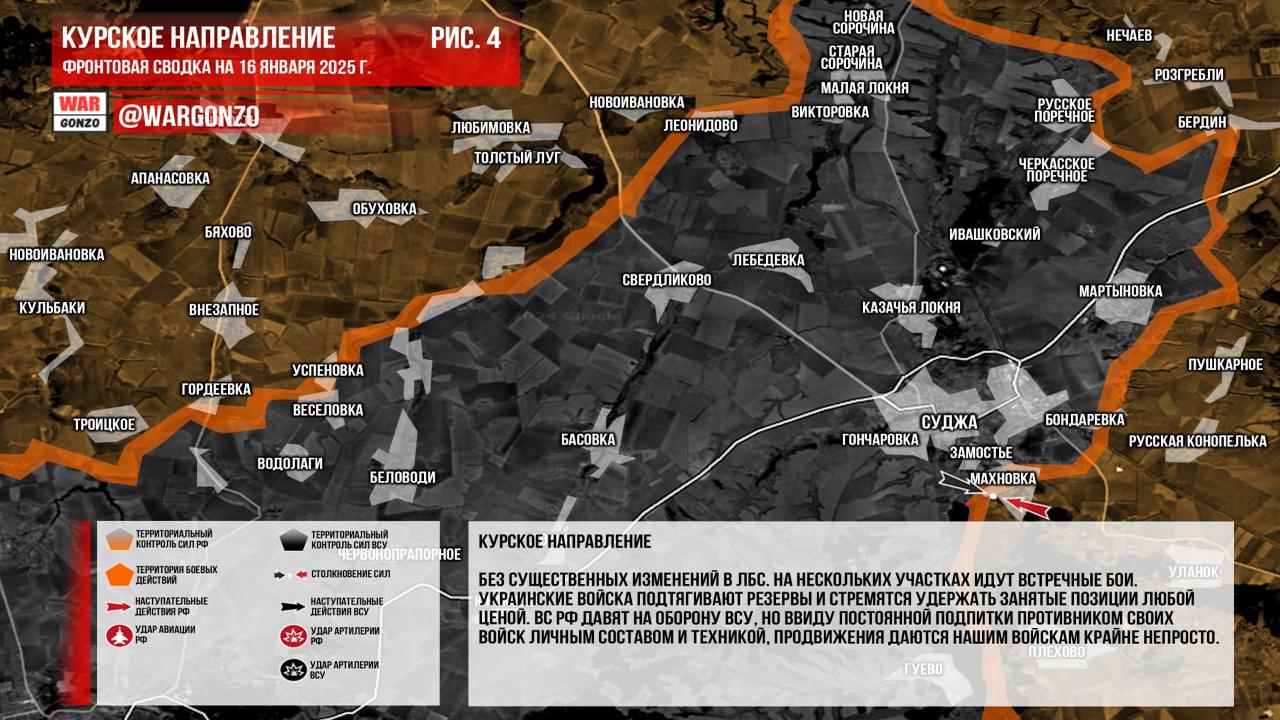 Ситуация на 16.01.2025 08:23. Канал Wargonzo сообщает: На утро 16.01.2025 информация о фронтовой ситуации показывает отсутствие существенных изменений на Запорожском фронте, где обе стороны активно используют средства дальнего поражения. На Донецком фронте российские войска продолжают расширять зону контроля в районе Великой Новоселки и ведут бои в окрестностях Нового Комара и Нескучного. Западнее Курахово российские силы улучшают позиции и наносят огневое поражение украинскому гарнизону. На Покровском направлении продолжаются ожесточенные бои, с российскими войсками, наступающими широким фронтом, в то время как украинские силы активно защищаются. В Дзержинске россияне продолжают подавление украинского гарнизона, однако о его освобождении еще рано говорить. На часовоярском направлении сообщается о переходе микрорайона Северный под контроль российских войск, но подтверждений этой информации пока нет. В Курской области также наблюдаются встречи боев, но без существенных изменений, при этом украинские войска усиливают свои позиции.»