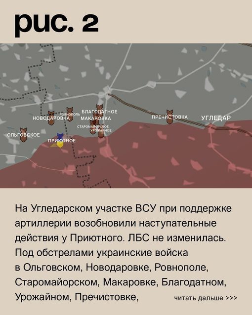 На Угледарском участке ВСУ начали наступление под прикрытием артиллерии в районе Приютного. Ситуация на линии соприкосновения не изменилась. Украинские войска подвергались обстрелам в населенных пунктах Ольговское, Новодаровка, Ровнополье, Старомайорское, Макаровка, Благодатное, Урожайное, Пречистовка, Угледар и Водяное (не путать с одноименным населенным пунктом к северо-западу от Донецка).
