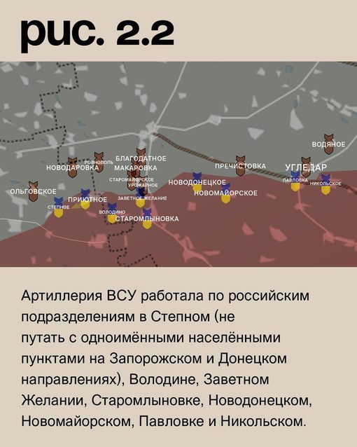 Артиллерия ВСУ наносила удары по российским подразделениям в Степном (не путать с одноименными населенными пунктами на Запорожском и Донецком направлениях), Володине, Заветном Желании, Старомлыновке, Новодонецком, Новомайорском, Павловке и Никольском.