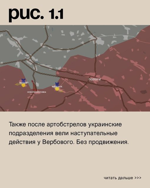 На Запорожском направлении ВСУ с поддержкой артиллерии пытались прорваться к Копаням, но безуспешно. Российские войска успешно отразили контратаку у Новопрокоповки. Украинские подразделения также предпринимали наступательные действия в районе Вербового, однако без продвижения. В результате обстрелов позиций украинских войск, населенные пункты Новоандреевка, Новоданиловка, Работино, Малая Токмачка, Гуляйполе, Малиновка и Полтавка оказались под ударами. Российские войска в свою очередь атаковали в Нестерянке, Ровном, Сладкой Балке, Ильченкове, Очеретоватом, Новопокровке, Новофедоровке, Дорожнянке, Марфополе и Новозлатополе.