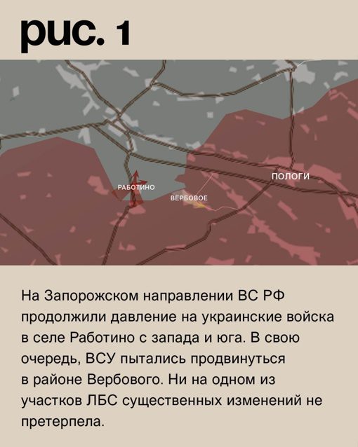 На Запорожском направлении российские войска продолжают оказывать давление на украинские силы в селе Работино с запада и юга. В свою очередь, ВСУ пытались продвинуться в районе Вербового. На Линии боевого столкновения значительных изменений не произошло.