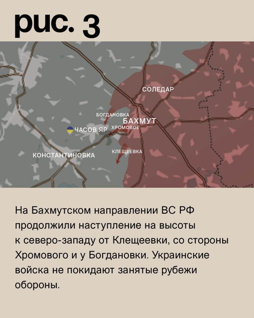 На Бахмутском направлении российские войска продолжают наступление на высоты к северо-западу от Клещеевки, а также со стороны Хромового и у Богдановки. Украинские войска пока не отступают с захваченных ими оборонительных позиций.